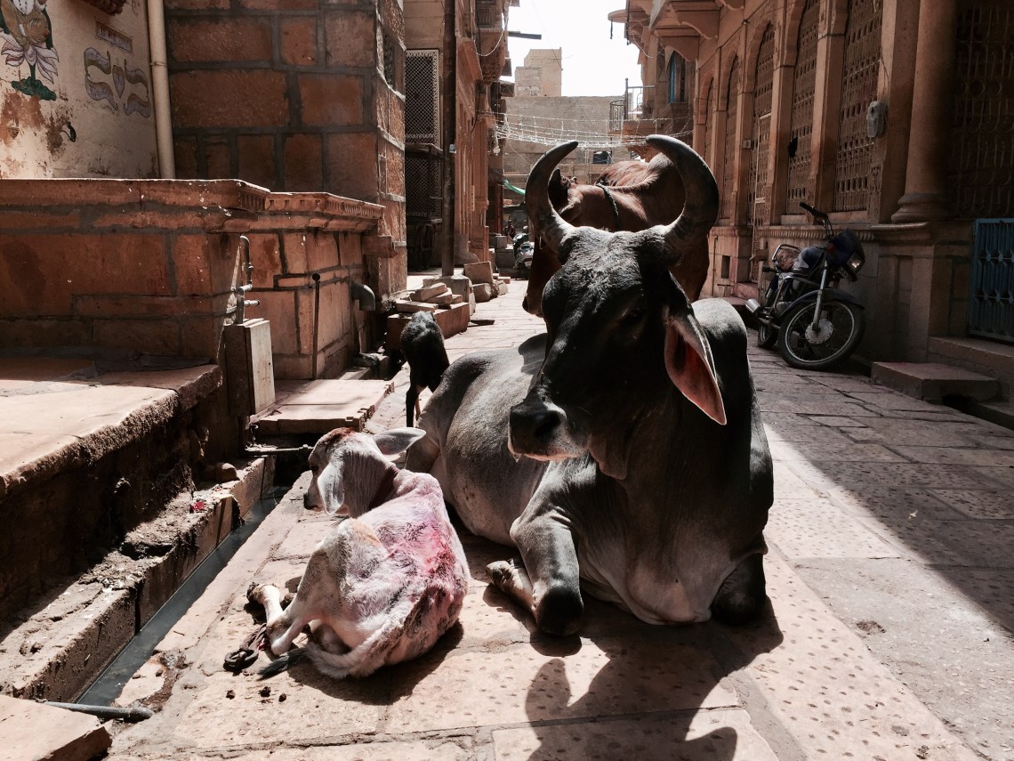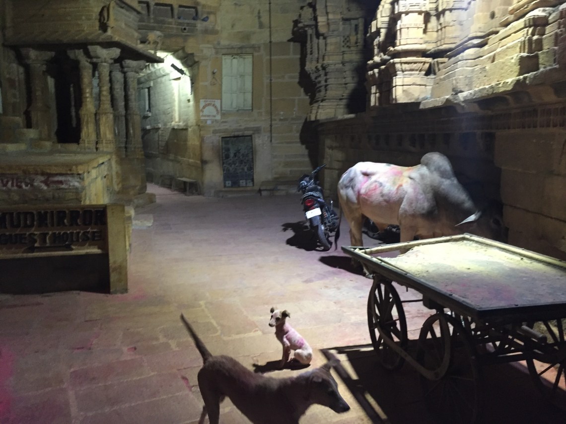 The alleys after midnight are populated with friendly stray dogs and hungry white cows. Some still have the pink powder dye of Holi on their backs.