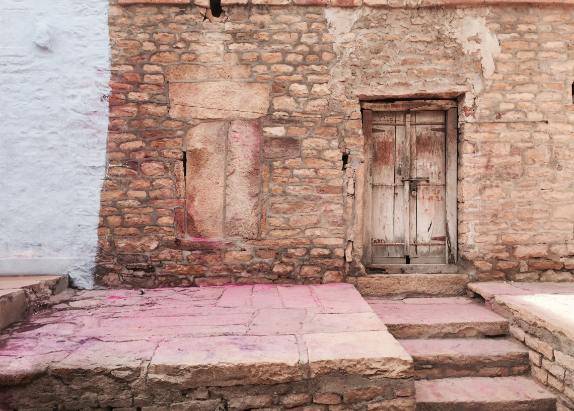 A ground shot of a stone at the front door of a house. Holi colours still line the paving, the water pipe and the horizontal spaces in the old blue front door.