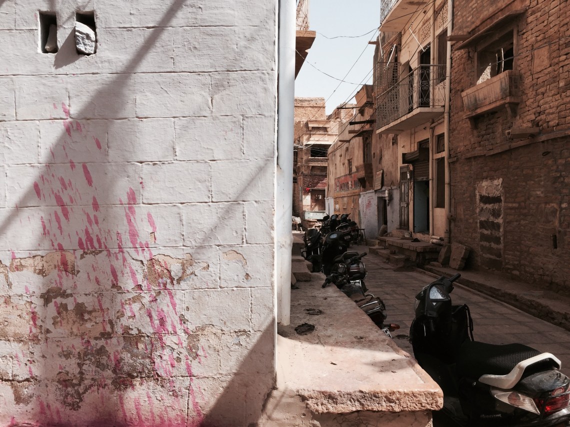 In the desert town of Jaisalmer, the pavements and brickwork made from locally quarried sandstone, are stained pink with Holi colours.
