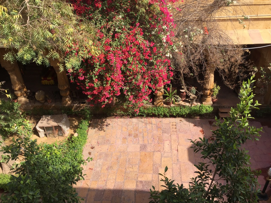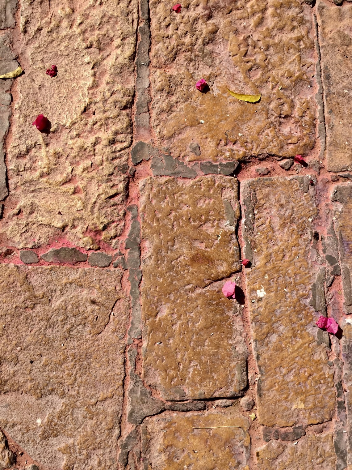 In the courtyard of a traditional hotel, a haveli, the pink powder dye hides in paving stones and matches the fallen petals of a bougainvillea.
