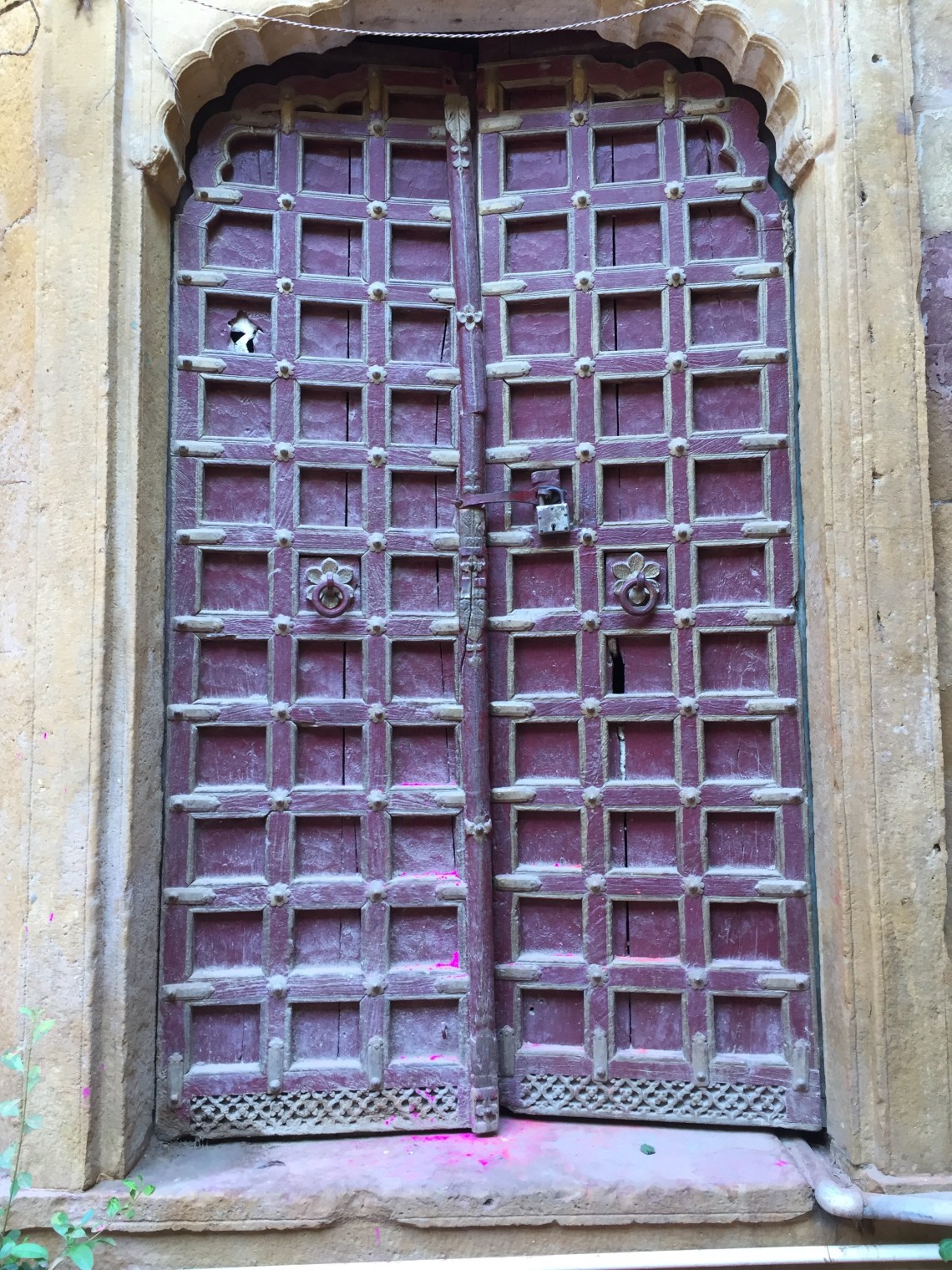 One of the impressive old doors of the fort backstreets. The left door and step have traces of the pink Holi powder. I wonder if the owners deliberately refrain from wiping them as reminders of positive reinforcement.