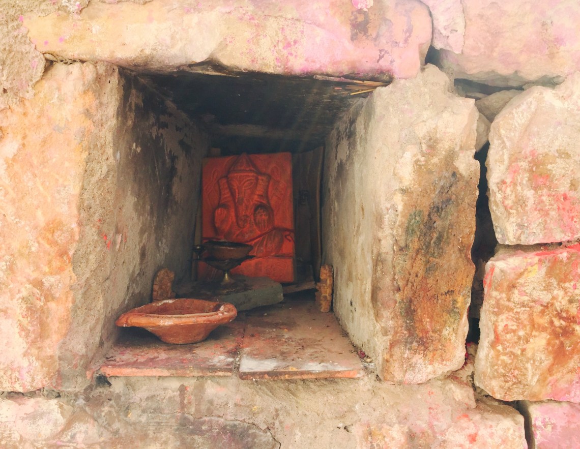 In a wall behind the Jain temple in the fort of Jaisalmer is a small alcove in the sandstone wall stained pink with Holi colours. Inside is a small temple with a clay butter lamp dedicated to the elephant-headed god, Ganesha.