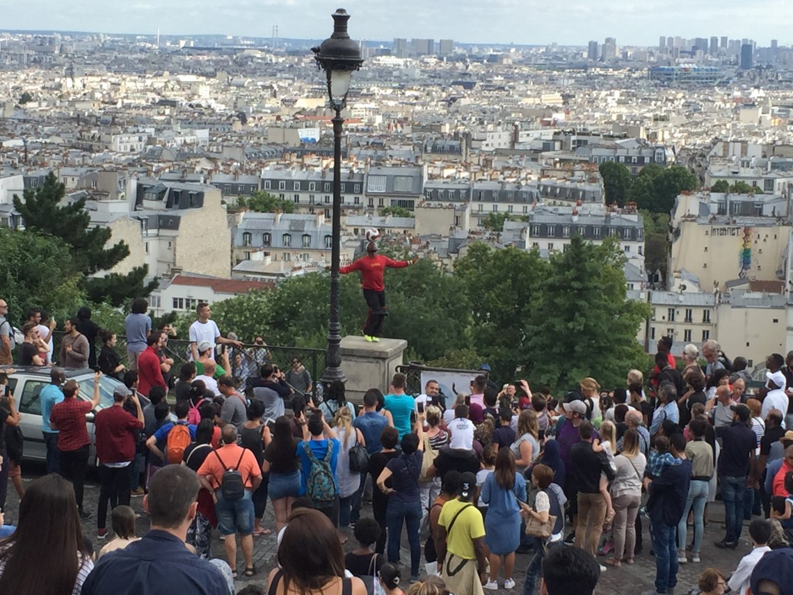 The view from Montmartre, a large hill in Paris is rather spectacular. But we all had eyes for a young lad from Ghana who tapped a football on his feet, head and shoulders, and could keep doing it whilst climbing up a lamp post taking his shirt off. The crowd were enthralled. People came to take selfies with him. What a star.