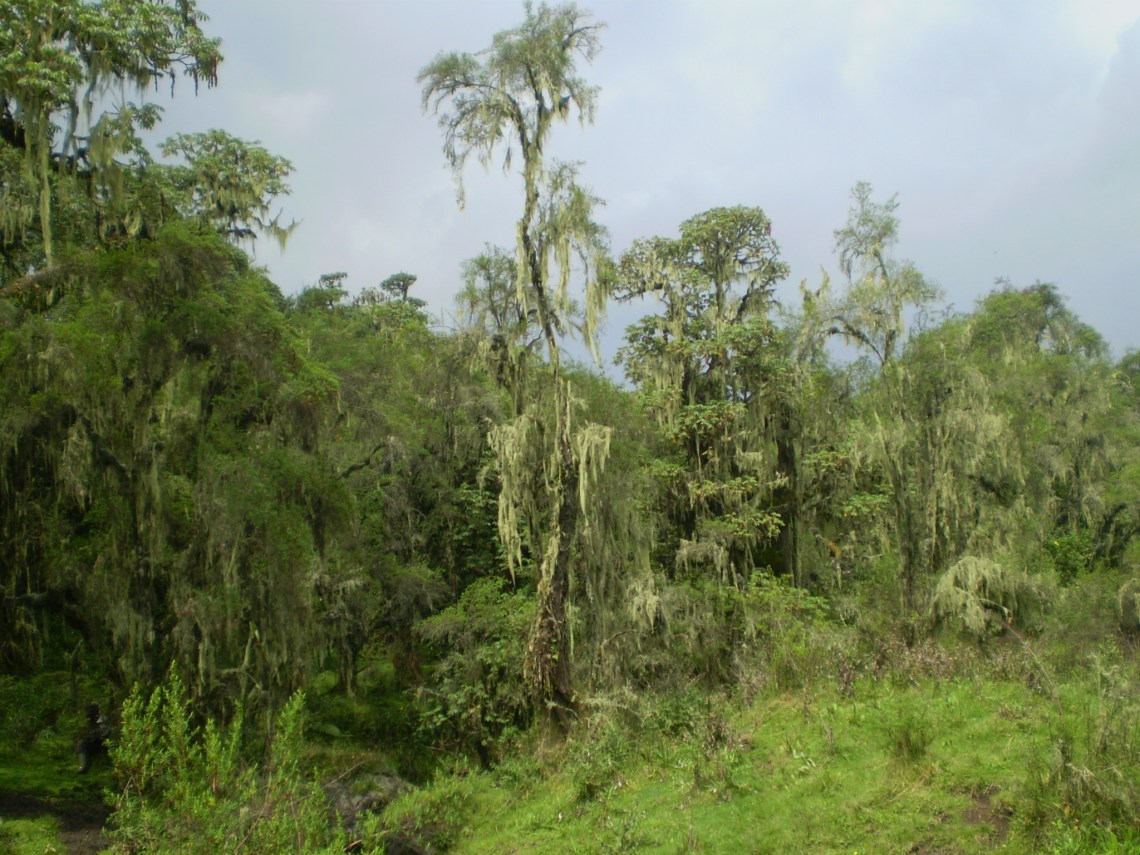 But Mount Karisimbi is a consummate entertainer, performing a play of carefully crafted scenes, curtains of mist their interludes; dense jungle; bogs and squelchy swamps; an enchanted wood of dripping vines and huge trees; grassy plains with grazing buffalo; spindly tree roots and fallen trunks clad with the green fur of ancient mosses; huge plants with giant spikey leaves like verdant parasols – and at the end, a 45 degrees slope up across a field of crumbly volcanic soil which, black grain by black grain, makes way for ice, hail and snowflakes. And the view above the cloud line to Mikeno in the north, Bisoke to the east and Nyiragongo in the west was the tumultuous, gob-smacking final scene.