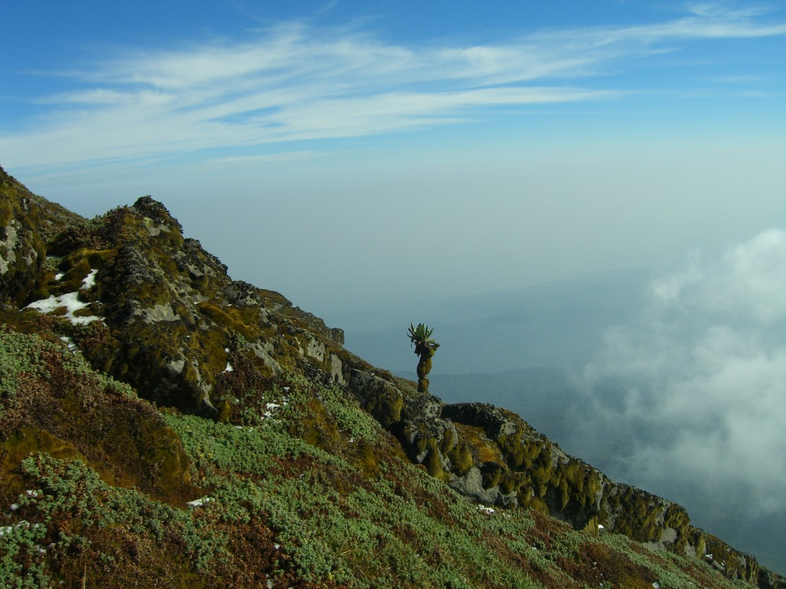 Karisimbi continued his entertainment, keeping our spirits up, keeping us wondering what the next act would hold. After the enchanted forest with old massive trees dripping with vines the previous day, we now met bizarre triffid-like plants; slippery fallen trunks zig-zagged like climbing frames before us.