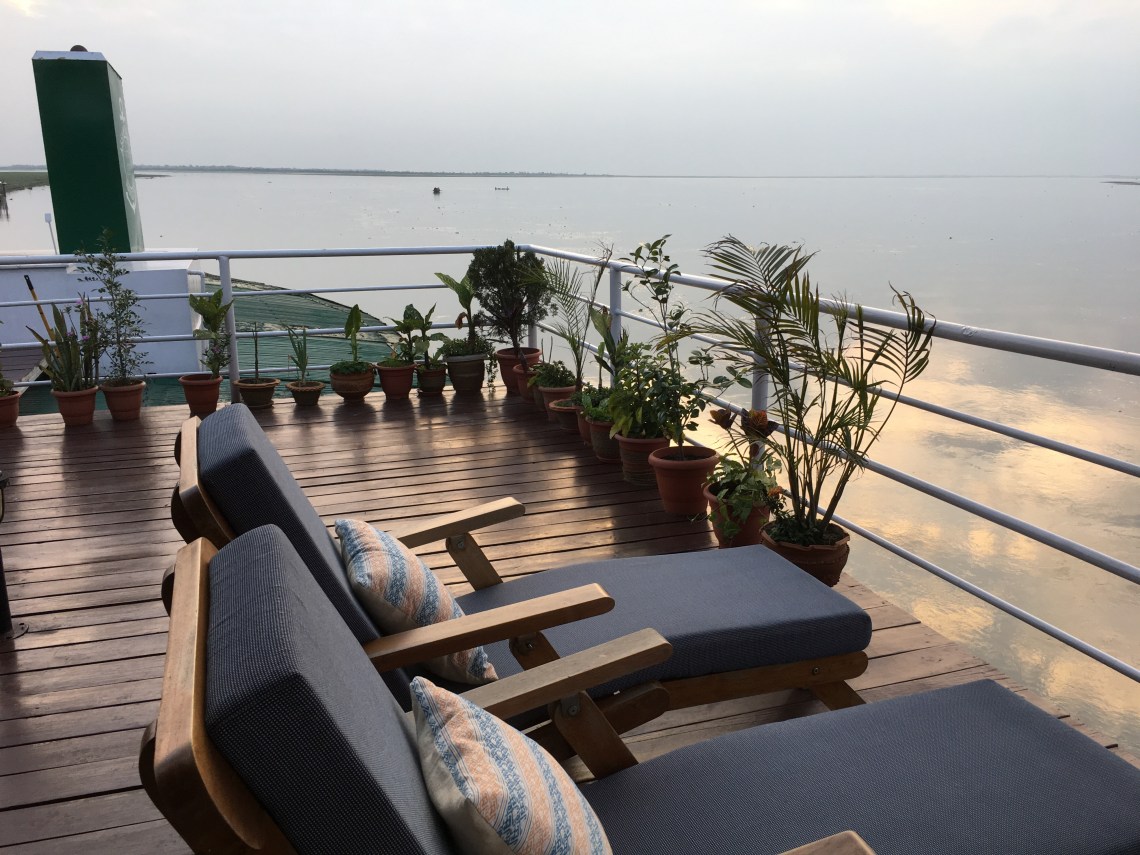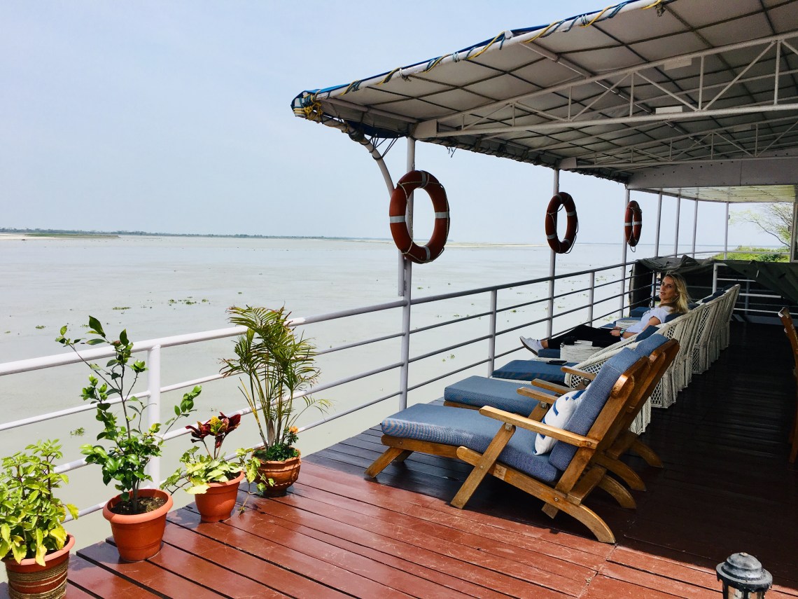 While we were in Majuli ,my cousin Ashish had got wind of us being in Assam and he whatsapped to ask where we were. Then he pinged back, ‘I’m sending a country boat to pick you guys up, you can stay on onboard my cruise ship stationed at Nimati’. We were thrilled.