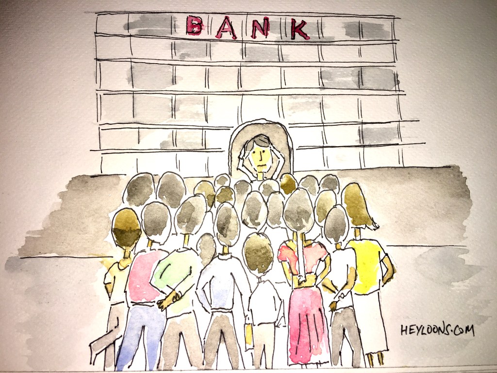 In the bank was a crowd of 30 to 40 people. This in India is a type of queue (USA, line) just a bit less linear and more freestyle.