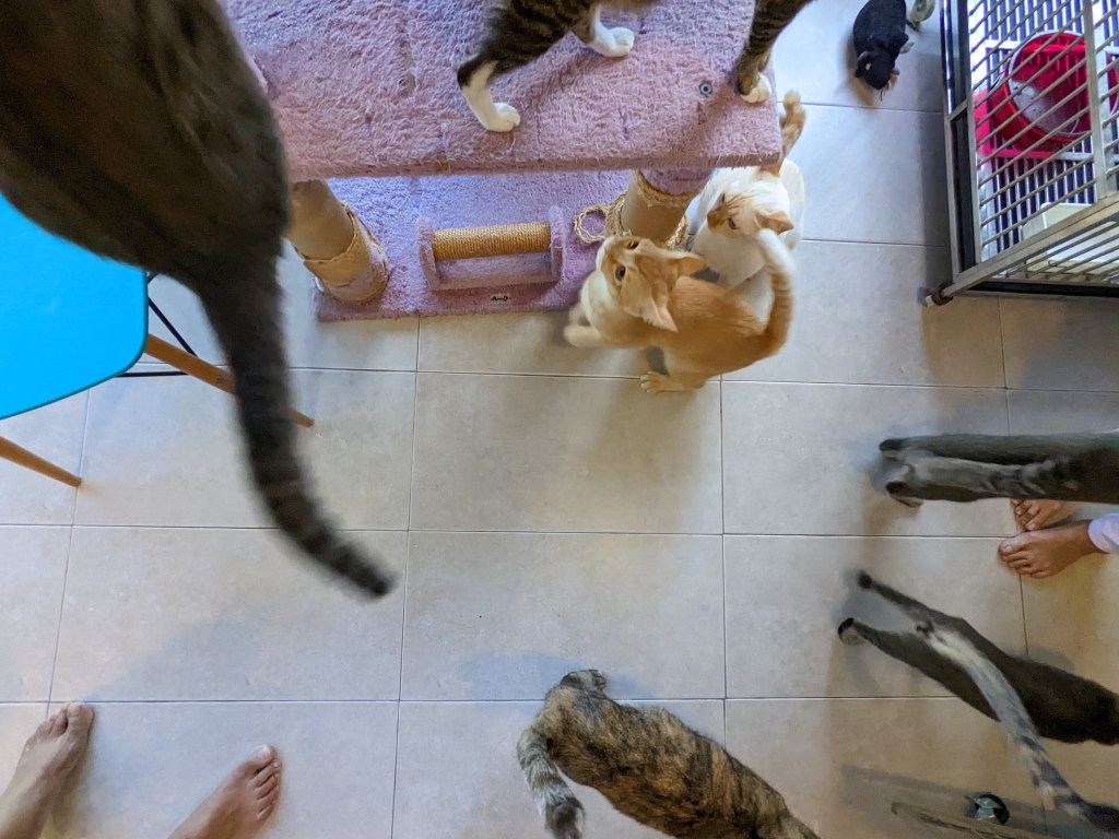 We went up some stairs and entered a cute, clean little cafe and ordered two ice coffees from the cafe’s owner Janet who served us and opened the sliding doors at the end of the room to the cat area. We removed our shoes, sanitised our hands and entered.
