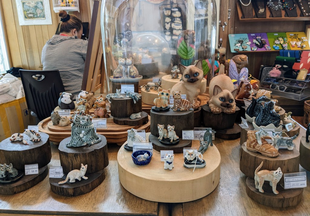 Kuching, a quiet riverside city in Sarawak, Borneo, is known as cat city (its name means cat although it’s probably come from the Mandarin word for port, cochin). There aren’t that many cats here in the city, but here’s a giant concrete cat statue, a cat museum and an airport cat memento shop.